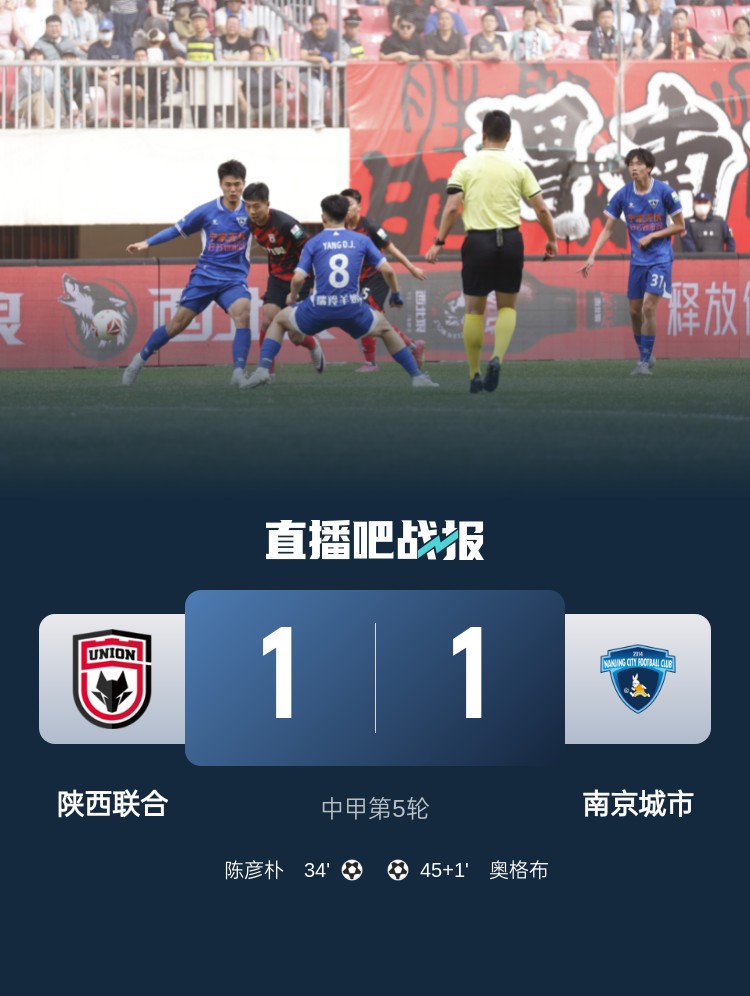 4月22日讯 北京时间4月22日15点30分,中甲第5轮,陕西联合在主场迎战南京城市。上半场,陈彦朴头球率先破门,奥格布反击扳平比分。下半场,两队都未能把握住机会破门。全场比赛结束,陕西联合1-1南京城市。