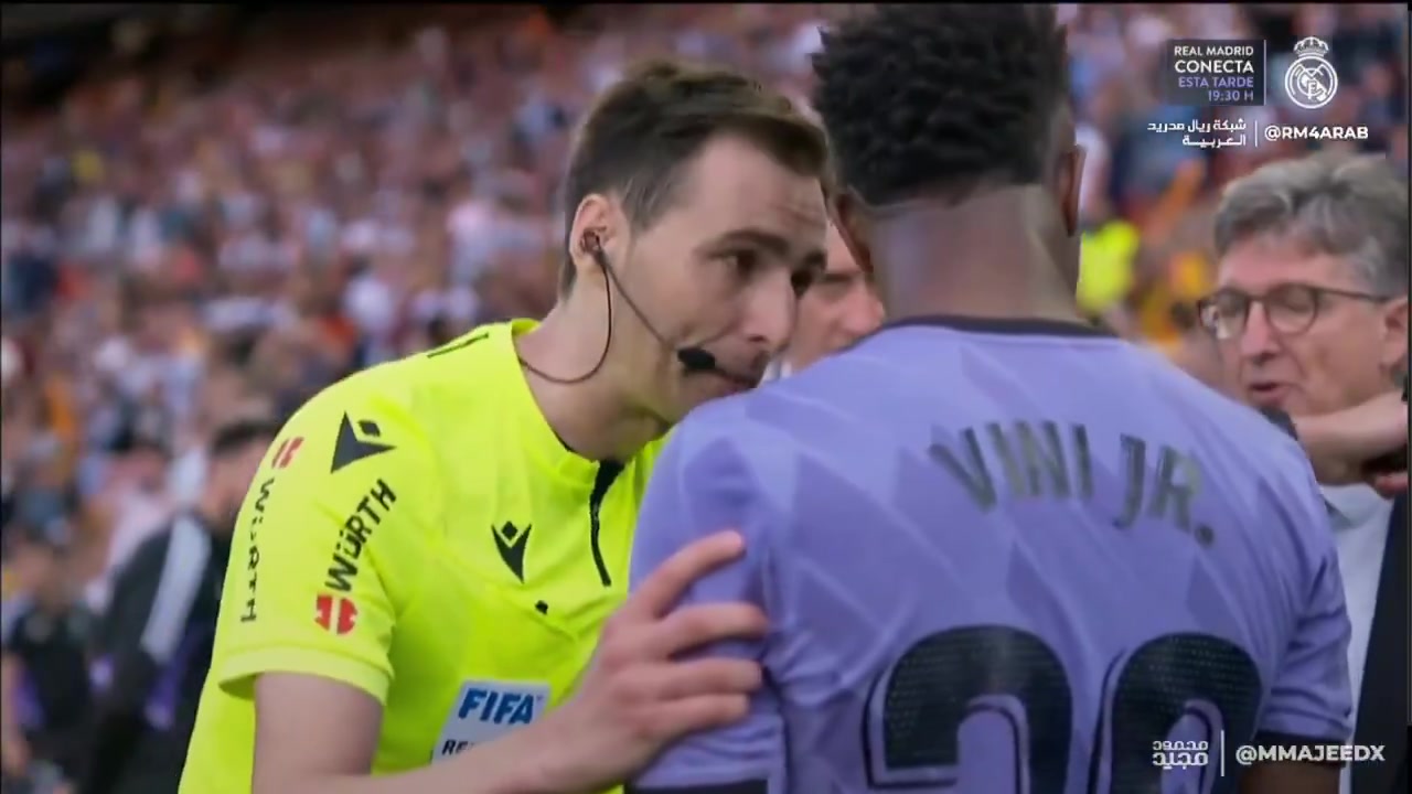 几分钟后,吕迪格从奥坎波斯脚下断球,德布尔戈斯示意比赛继续。但当皇马发起极具威胁的反击时,他却突然吹停比赛,罗德里戈、贝林厄姆和塞维利亚球员因未听到哨声继续比赛,最终贝林厄姆将球打进,主裁的决定令人费解。半场结束前,他还漏判了纳瓦斯对维尼修斯犯规的点球。